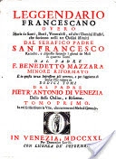 più Volumi le Vite prodigiose dei più celebri Figliuoli del mio gran Patriarca S.Francesco…” sono queste le parole di incipit che figurano nella prefazione al primo volume del Leggendario Francescano (ovvero “Istorie de Santi, Beati, Venerabili Ed Altri Uomini Illustri, Che Fiorirono Nelli Tre Ordini Istituiti Dal Serafico Padre San Francesco”), le quali illustrano chiaramente il fine prefissosi dall’autore dell’opera (1).Il Leggendario è stato “…scritto per la prima volta dal padre Benedetto Mazzara di Solmona, minore riformato della Provincia di S.Bernardino” dimorante nel Convento francescano di S.Nicola di Sulmona, ed è stato stampato in quattro tomi “in Venetia” nel 1676 presso Bartolomeo Tramontino.
