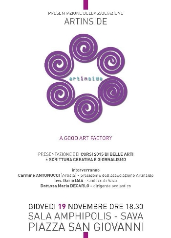 nella sala Amphipolis di piazza San Giovanni, alle 18,30. Nel corso della conferenza stampa, interverranno la presidente dell’associazione “Art Inside”, Carmine Antonucci, il sindaco di Sava, Dario Iaia, la dirigente scolastica dell’istituto comprensivo “Giovanni XXIII”, Maria De Carlo.«L’associazione “Art Inside” nasce e opera con lo scopo essenziale di promuovere la formazione sociale e culturale dei suoi associati e della comunità cui si rivolge attraverso eventi aperti al pubblico e a tutti i cittadini» si legge in una nota del sodalizio. «L’attenzione di “Art Inside” si rivolge alla divulgazione e all’implementazione delle teorie e delle tecniche delle belle arti, delle lettere, del teatro, del cinema, della filosofia e della musica.