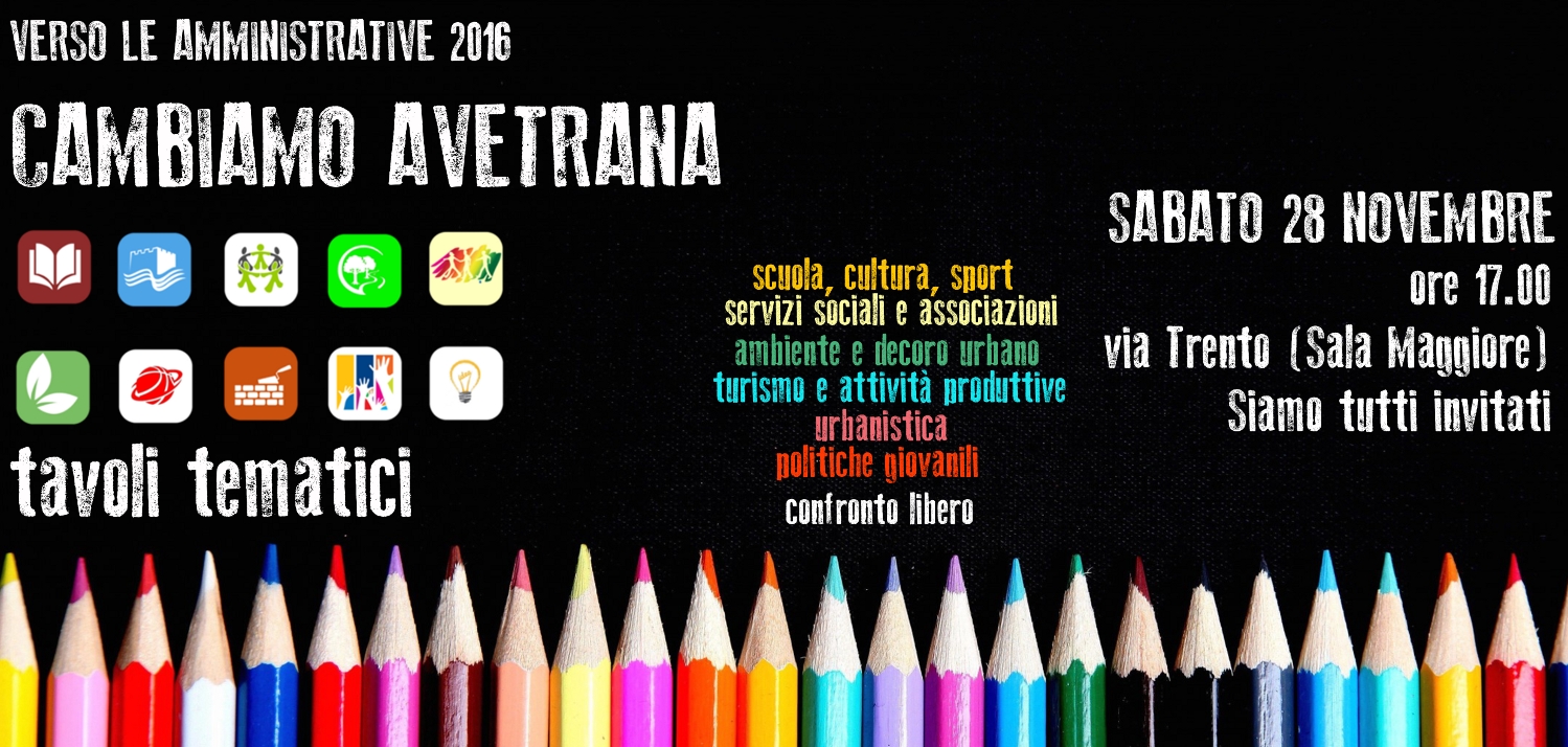 Nello scorso appuntamento, Attiviamo le Idee, che ha visto la partecipazione attiva di tanti cittadini con la volontà di cambiare, sono emerse numerose idee positive che hanno posto le basi ad un progetto concreto: dall’ambiente al turismo, al decoro urbano, dai servizi sociali alla cultura. Gli intervenuti hanno lanciato alcune parole chiave per il futuro della comunità avetranese: inclusione, restituzione degli spazi pubblici alla cultura ed allo sport (il Torrione come contenitore culturale attivo, il Palazzetto dello Sport protagonista della crescita sociale dei ragazzi), l'attenzione verso gli svantaggiati, l'ambiente, la programmazione turistica.