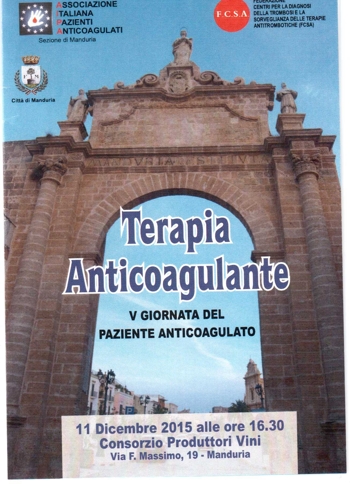 Giornata del Paziente Anticoagulato.Promossa dalla sezione di Manduria dell’Associazione Italiana Pazienti Anticoagulati e dalla Federazione Centri per la Diagnosi della Trommbsi e la Sorveglianza delle Terapie Antitrombotiche, l’iniziativa sarà aperta, alle 16,30, dal presidente dell’AIPA manduriana Ettore Maniglia. Dopo i saluti del sindaco di Manduria, Roberto Massafra, e del direttore medico del presidio sanitario orientale, Francesco Menza, i lavori, che saranno moderati da Cosimo Di Punzio, direttore dell’unità operativa “Patologia Clinica – Centro Trombosi FCSA” del “Giannuzzi”, prevedono l’intervento della presidente regionale di Feder-Aipa, Antonia Pertosa.