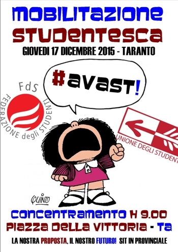 mobiliteranno in data giovedì 17 dicembre, insieme alla collettività scolastica tarantina, per rivendicare una scuola che permetta agli studenti, ai docenti e a tutto il personale scolastico di svolgere un'attività didattica dignitosa, che dia agli studenti gli strumenti per costruire il loro futuro.E non da poco ribadiamo questo concetto. Lo facevamo già il 27 Novembre 2014, quando la nostra proposta per una scuola democratica e del progresso veniva volgarmente snobbata dal presidente della Provincia. Ad un anno le cose non sono cambiate. Le scuole tarantine riversano sempre nella stessa ed instabile situazione ai limiti della sopportabilità e della sicurezza.