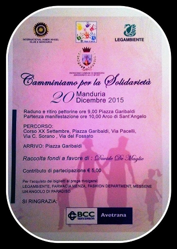 Domenica 20 dicembre p.v. si potrà partecipare a una manifestazione di solidarietà, non solo finalizzata a raccolta fondi per un nostro amico Davide De Maglie, ma anche per socializzare, per guardarsi, per sorridere, per stringersi la mano, anche per dire “…..anche tu qui ……….." Un giorno all’insegna della unione della semplicità e della concretezza. La racconta di fondi per Davide deve essere lo sprono per conoscerci, io so bene cosa significa stare in coma, so bene cosa significa per un genitore vedere immobile su un letto il proprio figlio e sentirsi impotenti. Domenica scendiamo in piazza tutti insieme alle 09,00 in Piazza Garibaldi, portiamo anche il nostro amato cane, diamo il nostro piccolo contributo di 5 euro per Davide, perché Davide possa ritornare a vivere a essere lo stupendo ragazzo che è sempre stato e che ritornerà a essere, ma ricordiamoci che questo dipende anche da noi, solo 5 euri, per riaccendere la speranza e la vita di una ragazzo meraviglioso come Davide.