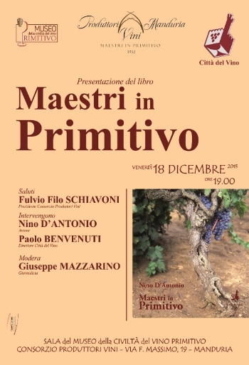 Nino D’Antonio, edito da “Città del Vino”.Con questa pubblicazione, si completa la trilogia delle opere della Consorzio Produttori Vini sul Primitivo di Manduria. Trilogia che, grazie anche alle immagini di fotografi del territorio, le tre opere raccontano la storia della cooperativa e l’avventura del Primitivo, vino che è stato utilizzato a lungo per elevare qualità e gradazioni di vini del nord e che invece ora ha conquistato i palati degli intenditori di tutto il mondo.