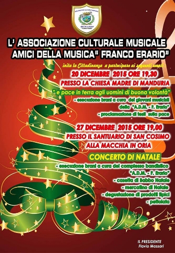 “Amici della Musica – Franco Erario” in programma in questi giorni. Il primo si terrà oggi (domenica) a Manduria e il secondo la domenica successiva (27 dicembre) nel santuario di San Cosimo alla Macchia.«Si comincia oggi (domenica), alle ore 19.30, presso la chiesa Madre di Manduria, con l’evento organizzato in collaborazione con la parrocchia ed intitolato “…e pace in terra agli uomini di buona volontà”» annuncia il presidente dell’associazione, Flavio Massari. «Durante la serata, alcuni ragazzi della associazione eseguiranno brani che richiamano il sentimento della pace, mentre, tra una musica e l’altra, verranno recitati alcuni testi prettamente inerenti il tema trattato. Si tratta di un evento fortemente voluto da don Franco e don Angelo, nonché dall’associazione, proprio per sottolineare come in un momento difficile, quale quello attuale, ci sia ancora la possibilità di uno spiraglio di pace».