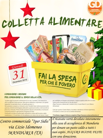 “Colletta alimentare”, con l’obiettivo di sostenere, attraverso la raccolta di generi alimentari, i cittadini e le famiglie bisognose del territorio.Le donazioni raccolte saranno devolute interamente alla Casa d’Accoglienza di Manduria. Sarà possibile, dunque, affidare parte della propria spesa ai volontari del punto di raccolta che sarà allestito nella mattinata di oggi (giovedì 31 dicembre) presso il centro commerciale Iper Sidis, sito in via Lizio Idomeneo, nei pressi della scuola Maruji-Frank di Manduria.