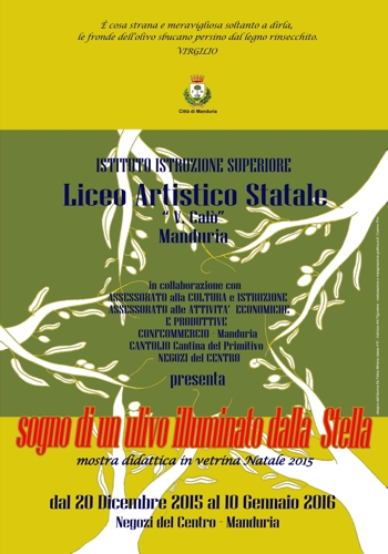 «Un invito alla riflessione il tema degli elaborati, intitolato “Sogno di un ulivo illuminato da una Stella”, concepito come la libera interpretazione visiva dei possibili incroci tra uno dei simboli del territorio pugliese e la luce del Natale» si legge in una nota della scuola manduriana. «Unire la drammatica questione del disseccamento e dell’eradicazione degli ulivi secolari alla simbologia della Stella natalizia, riferimento di energia e di indirizzo per l’uomo e per la natura, diventa, così, la rappresentazione della speranza nel significativo periodo delle festività natalizie».