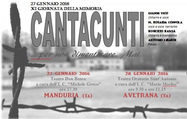 Saranno le scuole di Manduria (“Michele Greco”) e Avetrana (“Mario Morleo”) a ospitare il ritorno in scena per il 2016 dei Cantacunti, la compagnia di cantastorie più longeva di Puglia. A fornire l’’occasione è la Giornata della Memoria, dedicata alle vittime della Shoah. Due appuntamenti: il primo è in programma domani presso il teatro “Don Bosco”, a Manduria, e il secondo, il giorno dopo (giovedì), si svolgerà ad Avetrana, presso l’oratorio Sant’Antonio.