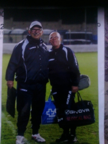 campo quando c’è da soccorrere qualcuno. Si tratta di Antonio Orlando, massaggiatore ed infermiere della USD Avetrana, nel calcio biancorosso da oltre 20 anni (era massaggiatore quando c’era come presidente Tino Laserra) e Dario Faggiana, massaggiatore del Fasano, che vediamo nella foto.