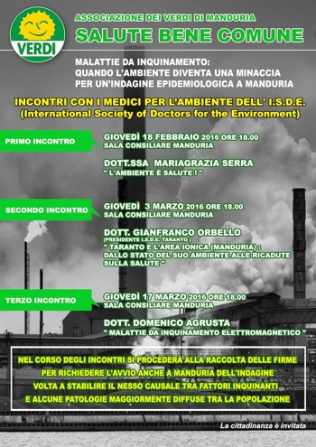 Quando poi sono proprio le matrici ambientali (suolo, acqua, aria), compromesse dall'opera dell'uomo, a costituire una minaccia per la stessa vita, si comprenderà come porre in relazione salute e ambiente all'interno della medesima nozione di bene comune sia ormai operazione necessaria e indifferibile. Così come ormai indifferibile è l'individuazione certa dei nessi causali tra inquinamento ambientale e patologie. E quanto si propongono di fare i Verdi, promuovendo una serie di incontri con “I.S.D.E. - Medici per l'ambiente”, che si svolgeranno secondo il seguente calendario: