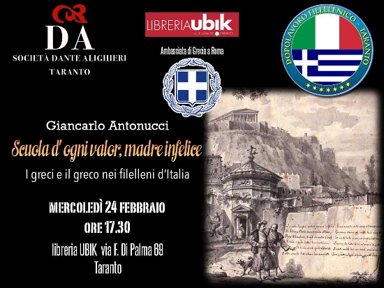 Un tentativo di mettere ordine nelle testimonianze note e nelle disponibilità delle proprie conoscenze relativamente a quanti in qualche modo e a qualsiasi titolo si siano interessati di Grecia nel passato e nel presente vuol essere la conversazione che Giancarlo Antonucci, fondatore e presidente dell'associazione culturale Dopolavoro Filellenico, terrà mercoledì prossimo 24 febbraio alle 17,30 presso la libreria Ubik di Taranto per conto della delegazione tarantina dell'Associazione Dante Alighieri presieduta dalla prof.ssa José Minervini, in collaborazione con il Dopolavoro Filellenico.