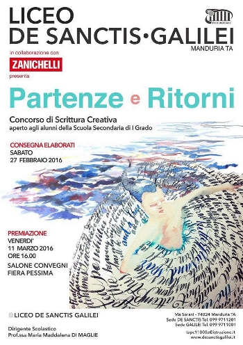 concorso narrativo promosso dal liceo classico e scientifico “De Sanctis-Galilei” di Manduria.Rispondendo alla sua naturale missione di apertura e valorizzazione della comunità scolastica, attiva e operante nel territorio, il liceo si propone di contribuire all’avvicinamento dei ragazzi al mondo della lettura e della scrittura, promuovendone la partecipazione diretta e attiva attraverso l’indizione di un concorso di narrativa letteraria, rivolto a tutti gli allievi che frequentano il terzo anno di scuola secondaria di primo grado, con particolare attenzione agli studenti del comprensorio di Manduria e dei comuni dell’area territoriale di riferimento.