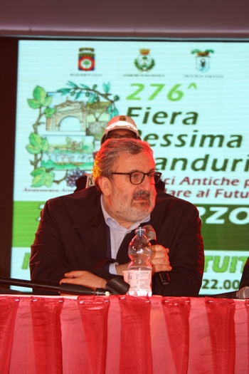 costretto, in un primo momento, ad annunciare il forfait per la cerimonia di inaugurazione della Fiera Pessima 2016, anche se con un po’ di ritardo, arriva a Manduria e interviene al convegno di apertura della rassegna.