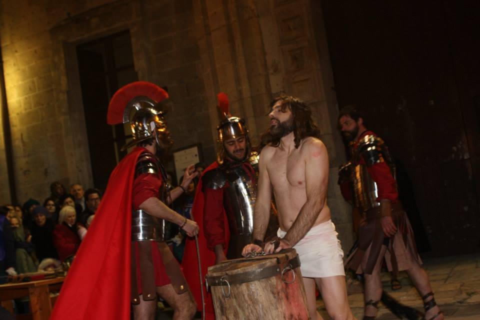 La “Via Crucis”, intesa come allegato successivo alla flagellazione, è un pio esercizio della Chiesa cattolica, con cui cristiani ricordano in preghiera il cammino di Gesù verso il Golgota, portando la sua santissima croce. Essa si compone tradizionalmente di “14 statio”, stazioni ognuna delle quali rievoca un momento determinato della Passione Vivente.