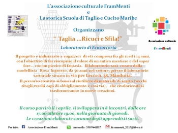 con la storica scuola di taglio e cucito Marìbe organizza il Laboratorio: “Taglia ...Ricuci e Sfila!” – Laboratorio di eco-sartoria per ragazzi/e.Il laboratorio che si terrà in via per Lecce n. 58 a Manduria, sarà curato interamente dalla modellista Forte Rosa, da 50 anni nel settore.
