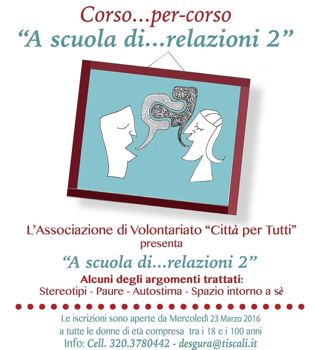 corso-percorso “A Scuola di Relazioni 2” ma con delle importanti novità.Visti i numerosi casi di violenza che si manifestano nelle relazioni familiari-sentimentali, l'associazione propone un corso che vuole mettere in evidenza quanto è importante andare ad analizzare e strutturare una relazione. Spesso ci sono dei segnali già dai primi approcci che vengono ignorati o giustificati che portano col tempo e con l'inadeguata gestione di queste ad atti spesso inspiegabili dagli stessi fautori attori.
