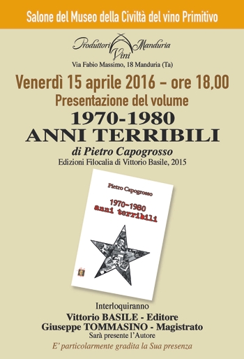 in Italia, ma anche anni fondamentali per la crescita della città messapica. Un decennio di grande importanza, che viene ricostruito, con dovizia di particolari, nella meticolosa ricerca di Pietro Capogrosso, dalla quale è scaturito il libro “1970-1980 – Anni terribili”, edito da Filocalia, che sarà presentato questa sera, alle 18, presso il salone del Museo della Civiltà del Vino Primitivo, all’interno del Consorzio Produttori Vini (in via Fabio Massimo 18).«Il volume tratta un periodo storico di grande importanza per gli avvenimenti che segnarono la storia del nostro Paese, soffermandosi sul decennio intercorso tra il 1970 e il 1980» si legge nella nota di presentazione del volume. «Come nelle sue precedenti pubblicazioni, Capogrosso innesta, sugli avvenimenti politici ed amministrativi manduriani, i concomitanti eventi nazionali ed internazionali: sono condensati, in modo chiaro ed esaustivo, fatti di grande rilevanza storica: dal golpe cileno di Pinochet, alla rivoluzione democratica portoghese, dal referendum sul divorzio, al rapimento di Aldo Moro, dal terremoto in Irpinia, alla bomba nella stazione di Bologna. Fatti che hanno richiesto un profondo e meticoloso lavoro di ricerca presso l’archivio di Stato e l’emeroteca».