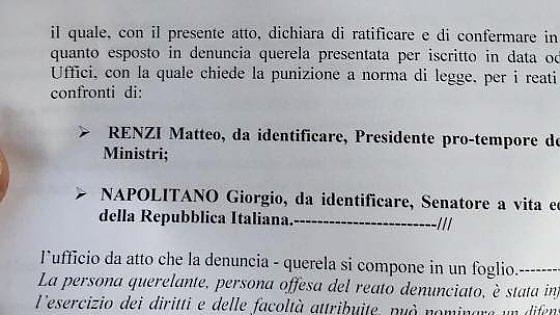 «Il presidente del consiglio dei ministri, Matteo Renzi, e l'ex presidente della Repubblica e senatore a vita Giorgio Napolitano hanno esortato il popolo italiano all'astensione dal referendum del 17 aprile e dunque vanno puniti secondo legge».
