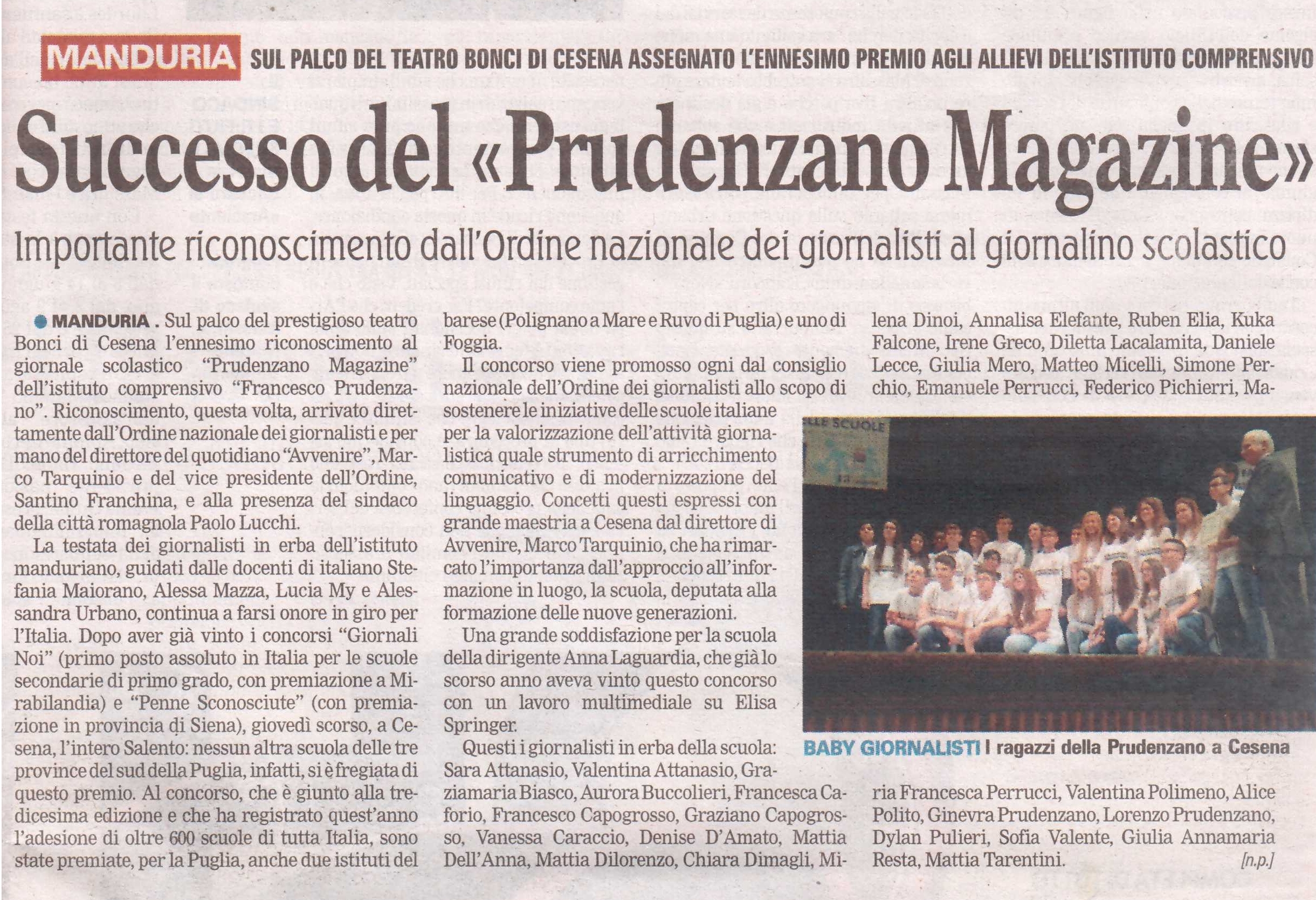 Terzo successo per il “Prudenzano Magazine”: il riconoscimento questa volta arriva nell’ambito del concorso nazionale promosso dall’Ordine Nazionale dei Giornalisti