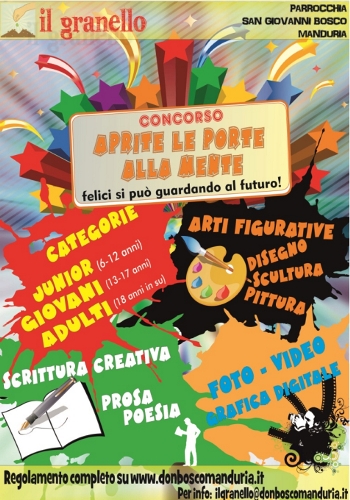 edizione di un concorso promosso dal gruppo culturale “Il granello” della parrocchia “San Giovanni Bosco di Manduria.Tre le sezioni previste nel concorso: arti figurative (disegno, scultura, pittura), scrittura creativa (prosa, poesia) e foto, video e grafica digitale. Tre anche le categorie: Junior (da 6 a 12 anni), Giovani (da 13 a 17 anni) e Senior (da 18 anni in su).
