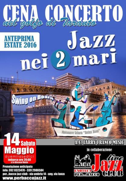 Taranto è stupenda vista dal mare di serA, sorseggiando vini ed ascoltando buona musica jazz, immersi in un’atmosfera naturale meravigliosa..un sodalizio vincente sfociato nel piacere di organizzare eventi di altissima qualità quello creatosi tra la professionalità del Per...bacco Jazz Club e l’Associazione Culturale Larry Franco Music a cui affidata la parte musicale di quest'evento. Il 14 maggio, in questa "anteprima" della stagione estiva, Larry Franco (pianoforte e voce) suonerà in compagnia del suo quartetto con Attilio Troiano polistrumentista alla tromba e al sax, Ilario De Marins al contrabbasso ed Egidio Gentile alla batteria, e della jazz singer Dee Dee Joy. Questo sarà il primo concerto di una lunga serie che, a partire da giugno fino a fine luglio, si terranno a bordo tutti i venerdì.