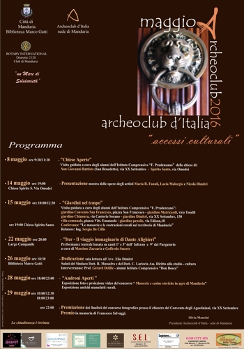 Questi alcuni dei successivi appuntamenti del “Maggio Archeoclub” 2016. Sabato 14 maggio, alle ore 19, saranno presentate, presso la chiesa dello Spirito Santo, alcune opere degli artisti Maria Rosa Fanuli, Lucia Malorgio e Nicola Dimitri.