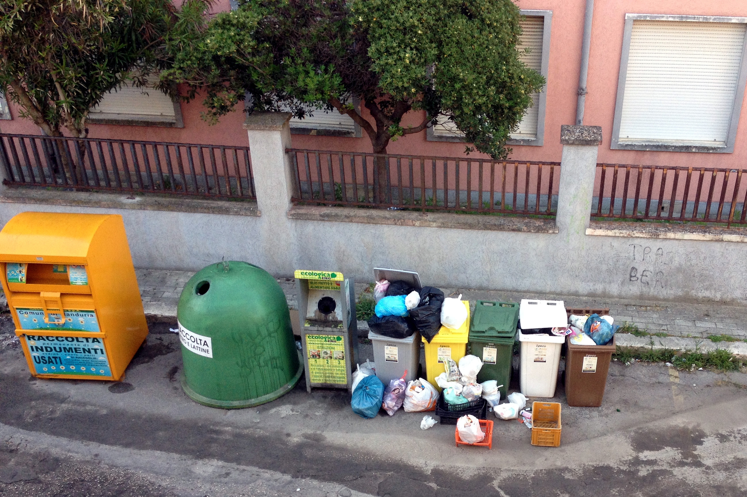 «Sabato mattina questi bidoni sono stati posizionati in via Monte Grappa, a ridosso della scuola media e più precisamente alle spalle dell’istituto scolastico» scrivono alcuni residenti al sindaco Roberto Massafra, al Comando della Polizia Municipale e all’Ufficio Igiene. «Ciò ha comportato delle vivaci proteste fra i residenti in questa via, in quanto, a detta degli operatori di Igeco, questi bidoni dovrebbero servire al condominio di via Lizio Idomeneo. A parte la questione igienica (sono stati posizionati proprio davanti alle finestre delle aule della scuola), facciamo notare che questi bidoni dovrebbero essere gestiti in proprio dal condominio di competenza ed esposti solo nei giorni di raccolta. Attualmente diventano a disposizione di tutti i cittadini, che abbandonano ogni tipo di rifiuto.