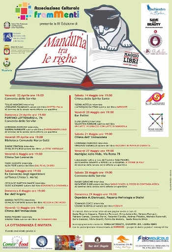 Altro fine settimana con gli appuntamenti letterari (precisamente il settimo e l’ottavo) della terza edizione della rassegna “Manduria tra le righe – Il Maggio dei libri”,