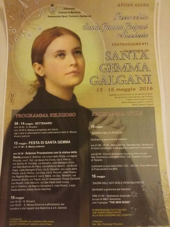 Manduria in onore di Santa Gemma Galgani.Una festa voluta fortemente dai parrocchiani di una chiesa da sempre considerata purtroppo di “periferia”: il quartiere, che porta il nome della santa, si trova oltre i binari ferroviari che costeggiano la circonvallazione. Proprio per questo, i fedeli e il parroco, don Tommaso Prisciano, hanno scelto di portare in processione la santa oltre il passaggio a livello, sino a raggiungere la centralissima piazza Garibaldi.