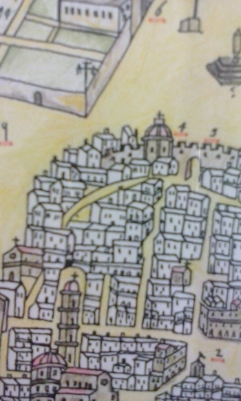 Inoltre, va detto che nella carta di Casalnuovo-Manduria del 1643, proveniente dall’archivio di casa Imperiali, l’edificio contrassegnato dal n.4 è chiaramente riportato, come costruzione ancora indipendente, nei pressi proprio della Porta del Mare (anticamente Porta di Nettuno).