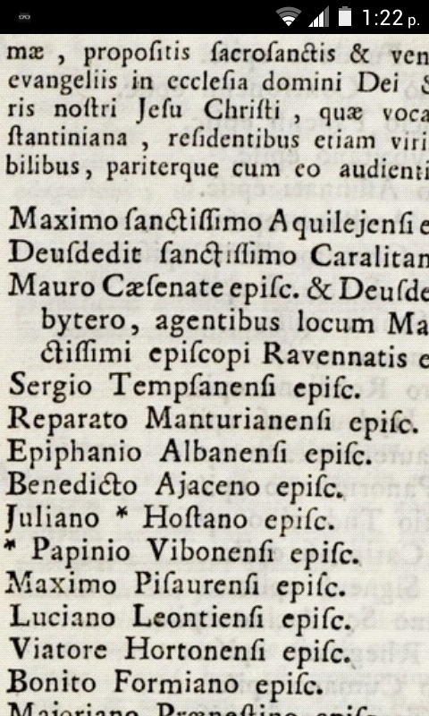 Ma un’altra importante traccia della presenza di un vescovo a Manduria fino all’anno 649 sarebbe, secondo altri autori, contenuta negli atti del concilio celebrato dal 5 al 31 Ottobre di quell’anno nella basilica di S.Giovanni in Laterano in Roma, sotto la presidenza di Papa Martino I e con la partecipazione di 105 vescovi provenienti da varie parti, tra cui, principalmente, l’Italia peninsulare, la Sicilia, la Sardegna e l’Africa.