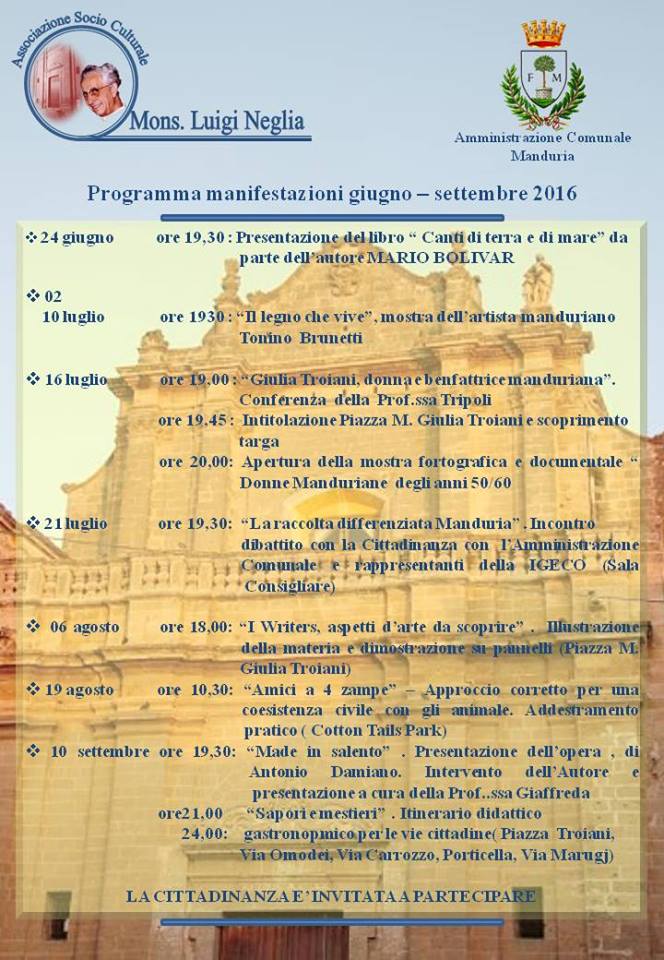 Manduria ricorda don Luigi Neglia, l’arciprete che ha caratterizzato diversi lustri del secolo scorso della vita cittadina. L’associazione che porta il suo nome ha programmato una serie di iniziative. Ieri (giorno in cui si festeggia san Luigi Gonzaga) e oggi, alle 19, saranno celebrate due Messe: quella di oggi nella parrocchia della Santissima Trinità e quella di domani in piazza “Luigi Neglia”.