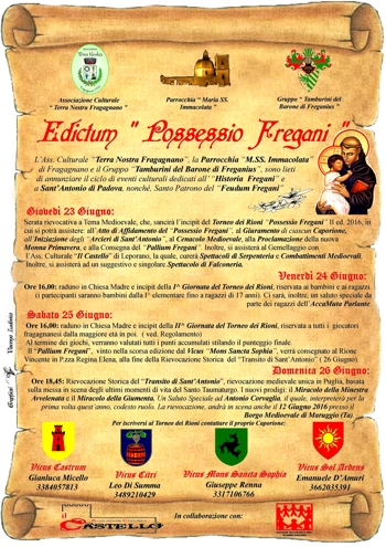 Giovedì scorso c’è stata la serata rievocativa a tema medioevale. Ieri sera è stata la volta della prima giornata del Torneo dei Rioni “Possessio Fregani”, riservata ai bambini e ai ragazzi. Vi è stato, inoltre, un saluto speciale da parte dei ragazzi dell’“AccaMuta Parlante” di Fragagnano.