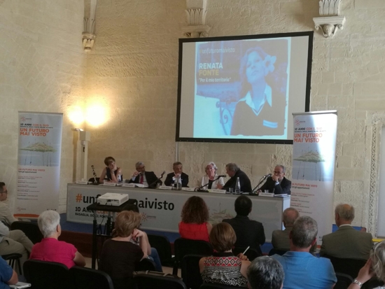 A concludere i lavori è stata la presidente della Commissione Antimafia Rosy Bindi: “Sono passati molti anni dal barbaro omicidio di Renata Fonte - ha detto la presidente - ma il sogno che alimentava la sua battaglia in difesa della legalità e contro la speculazione edilizia è una realtà. Oggi Porto Selvaggio è un parco naturale di straordinaria bellezza, la prova che è possibile fare sviluppo in armonia con la natura. Renata lo credeva possibile e aveva davvero ‘visto’ il futuro della sua terra. Era una giovane donna del Sud, con la passione per la politica, quella ispirata al bene comune e alla buona amministrazione, che risolve i problemi dei cittadini nel rispetto delle regole, con la trasparenza e la partecipazione. Di fatto incarnava tutto ciò che ostacola le mafie e per questo ha pagato con la vita. La sua storia di coraggio e impegno pubblico merita di essere riscoperta, come un esempio di buona politica - ha concluso Bindi - Trovo molto bella la scelta della Fondazione CON IL SUD di celebrare i dieci anni di attività nel segno di Renata Forte, Danilo Dolci, Don Lorenzo Milani, Franco Basaglia e Adriano Olivetti. Persone che hanno lasciato un segno profondo, coerente con la visione del cambiamento possibile e di futuro migliore per tutti e che rappresentano bene la ‘vocazione’ della Fondazione CON IL SUD”.