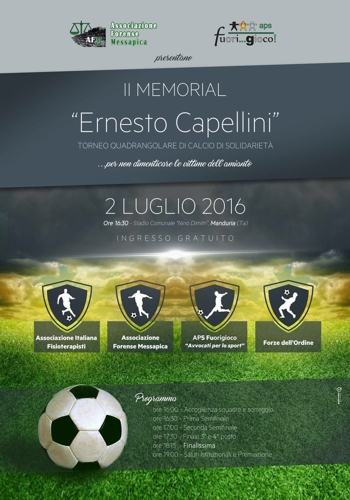 lo stadio Comunale Nino Dimitri di Manduria si terrà una interessante manifestazione sportiva con importanti risvolti sociali.L’associazione di promozione sociale “Aps Fuorigioco” da sempre impegnata nella promozione dello sport, con la convinzione che esso possa rappresentare un ottimo veicolo per affrontare tematiche di carattere sociale, e l’Associazione Forense Messapica, organizzano il 2° Memorial “Ernesto Capellini”, in ricordo di tutte le vittime dell’amianto.