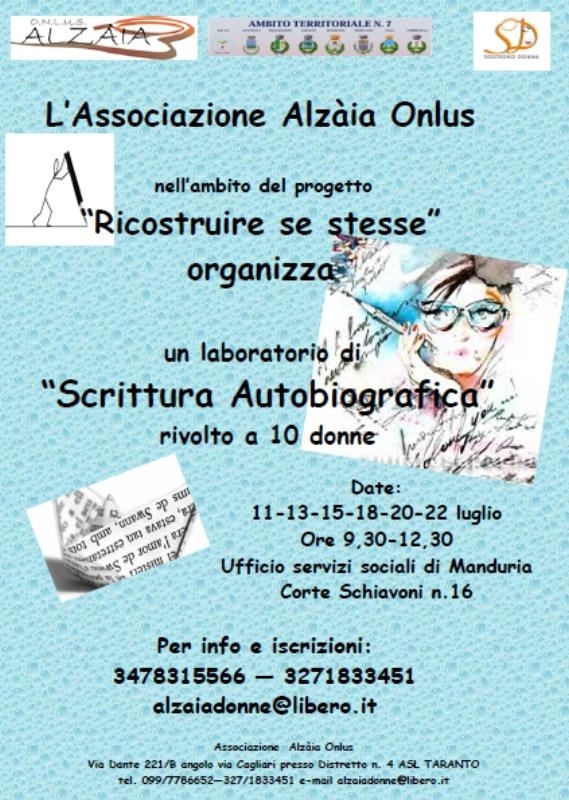 donne. Lo promuove l’associazione “Alzaia”, nell’ambito del progetto “Ricostruire se stesse”. Si svolgerà, a partire da oggi, presso la struttura di proprietà comunale ubicata in corte Schiavoni 16.“Alzaia”, nell’ambito della programmazione degli interventi contro la violenza di genere, ha sottoscritto una convenzione con l’Ufficio Sociale di Ambito di Manduria, che ha previsto, fra le altre cose, anche l’attivazione di uno sportello antiviolenza in via Pacelli. Questo del laboratorio di scrittura autobiografica è solo una delle iniziative che saranno attuale su questa delicata tematica. Si snoderà in sette incontri, che avranno luogo l’11, il 13, il 15, il 18, il 20 e il 22 luglio, dalle ore 9.30 alle ore 12.30.