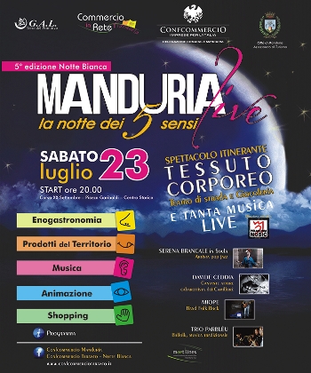 «Se infatti la serata, nell’auspicio della Confcommercio locale e del Gal, mira a valorizzare con stand gastronomici, punti ristoro, mercatini e locali aperti le eccellenze enogastronomiche delle Terre del Primitivo e in più in generale della Puglia, l’offerta degli eventi e spettacoli ne è un naturale contraltare» si legge in una nota degli organizzatori. «Si partirà con la clownerie e il teatro danza del gruppo Tessuto Corporeo, animato dal performer professionista Alberto Cacopardi, padovano di nascita ma ormai pugliese d’adozione, già protagonista indiscusso del panorama nazionale di arti circensi e giocolerie.