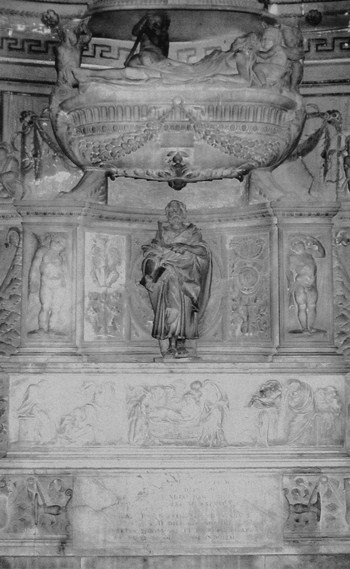Le fonti documentarie sono infatti incredibilmente avare di notizie sulla tomba Bonifacio, le cui coordinate storiche, stilistiche ed iconografiche si sono finora potute ricostruire essenzialmente partendo dall’opera, che resta pur sempre “il primo documento di se stessa”. Piuttosto ampia è la bibliografia relativa al monumento, che qui non richiamiamo: accenniamo soltanto al fatto che, se la questione attributiva pare pressochè risolta, restano ancora non completamente sciolti i nodi relativi all’iconografia (e all’ iconologia). In questo senso ,proponiamo agli studiosi di approfondire la narrativa della movimentata predella, poiché non è ancora chiaro, al di là dell’evidente valore allegorico della scena rappresentata (che associa la morte del giovane Andrea Bonifacio a quella di Cristo), se essa contenga, come a noi pare, anche elementi di verismo. Essa potrebbe infatti contemplare la presenza dei genitori del giovanetto, Roberto e Lucrezia, ai margini estremi della raffigurazione.
