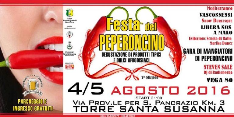 La festa, giunta alla settima edizione, è organizzata da A.S.D. Amatori Gioventù Sport Torre con il patrocinio del Comune di Torre Santa Susanna, dell’Accademia Italiana del Peperoncino e con la media partnership di Idea Radio.