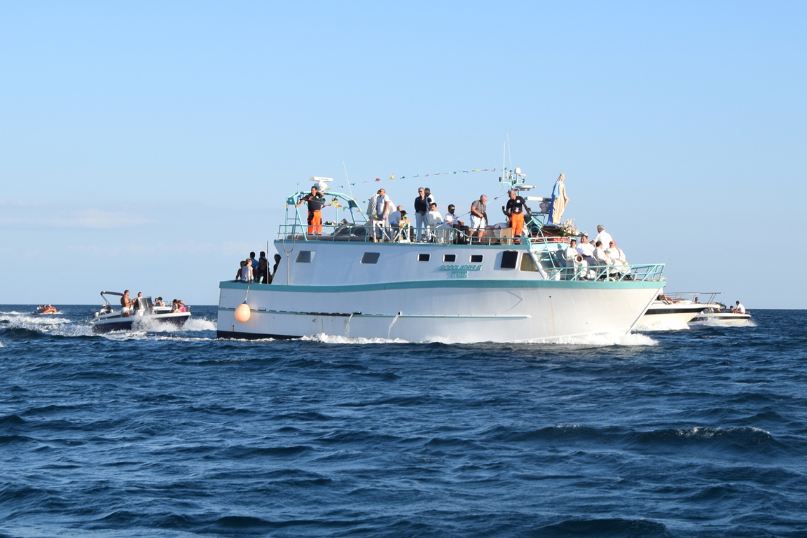Il programma della festa religiosa prevede la processione in barca: la statua della Madonna, della parrocchia di Torre Colimena, viene portata sull’imbarcazione più grande, messa a disposizione dal signor Franco Scarciglia, che poi apre, intorno alle 17, il corteo in mare. La Lega Navale trasporta, con le imbarcazioni dei propri soci, gli altri fedeli.