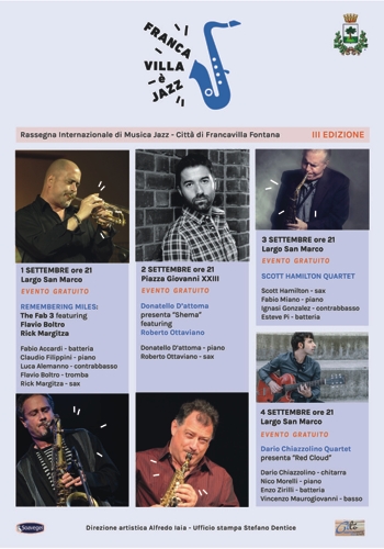 dell’estate francavillese, una kermesse di prestigio che calamita l’attenzione di un pubblico assai vasto, formato non solo da jazzofili. Largo San Marco, incantevole scorcio situato nel cuore del centro storico e la suggestiva piazza Giovanni XXIII, saranno le cornici dei quattro concerti in programma per questa edizione.