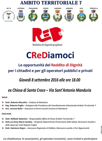 «Il Reddito di Dignità, introdotto dalla Regione Puglia con la legge numero 3 del 14 marzo 2016, si propone, attraverso progetti di tirocinio per l’inclusione sociale, di attuare strategie di contrasto al disagio socioeconomico, alla povertà e all'emarginazione sociale attiva delle persone e dei rispettivi nuclei familiari, la cui situazione economica non consenta di disporre dei mezzi sufficienti ad una vita dignitosa» si legge in una nota dell’Ambito Territoriale numero 7, al quale aderiscono i Comuni di Manduria (capofila), Avetrana, Fragagnano, Lizzano, Maruggio, Sava e Torricella, insieme alla Asl.