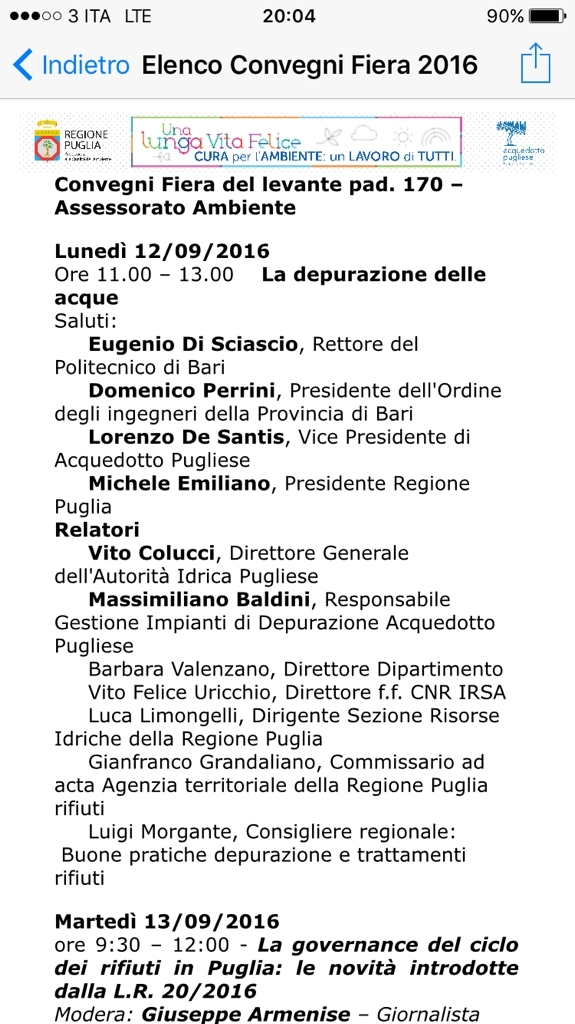 Seguiranno gli interventi di Lorenzo De Santis, vice presidente di Acquedotto Pugliese; Luca Limongelli, dirigente sezione Risorse idriche della Regione; Vito Colucci, direttore generale dell’Autorità Idrica Pugliese; Massimiliano Baldini, responsabile Gestione impianti di depurazione di AQP; Barbara Valenzano, direttore dipartimento Mobilità, Qualità urbana, Opere pubbliche, Ecologia e Paesaggio della Regione, Vito Felice Uricchio, direttore del CNR IRSA, Gianfranco Grandaliano, presidente di AMIU Puglia.
