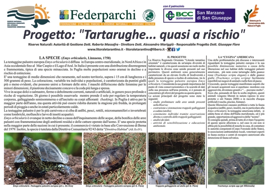 Saranno presentati mercoledì, alle ore 10, nella sala consiliare del Comune di Manduria i risultati delle attività di monitoraggio sulle tartarughe palustri “Emys Orbicularis”, specie in via d’estinzione, presenti nelle Riserve Naturali del Litorale Tarantino Orientale.