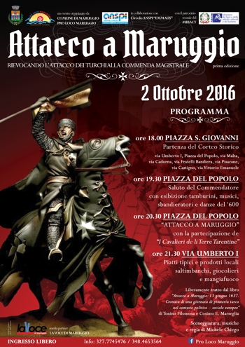 Ispirandosi al libro “Attacco a Maruggio: 13 giugno 1637” di Tonino Filomena e Cosimo E. Marseglia, Michele Chiego ha ora liberamente tratto il copione della prima edizione della rievocazione storica “Attacco a Maruggio”.