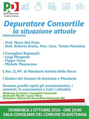 di Avetrana su iniziativa della locale sezione del Partito Democratico. Si ritorna a discutere del progetto del depuratore consortile di Manduria e Sava, per il quale si continua ad attendere il “taglio” ufficiale della condotta sottomarina.