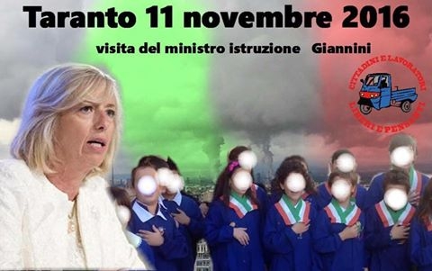 Non abbiamo apprezzato il fatto che i “nostri” bambini vengano strumentalizzati per l’ennesima accoglienza in stile “ventennio” di un ministro e delle istituzioni. Sarebbe giusto che i genitori, mentre plaudono il ministro e il sindaco, ricordassero i dati sul tasso mortalità dei bambini a Taranto, più alto del 30 per cento rispetto al resto d’Italia. Dovrebbero ricordarsi delle ordinanze firmate per impedire ai “nostri” figli di giocare nei parchi, o di aprire la finestra nelle giornate di vento da nord - nord/ovest. E dovrebbero ricordarsi di chi continua a non “vedere” pericoli immediati per la salute della comunità».