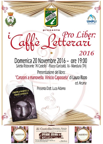 Pro Loco di Manduria, ideata per presentare opere di scrittori locali o riguardanti il territorio. Questa sera, alle 20, presso la saletta del ristorante “Al Castello” (in piazza Garibaldi), nuovo “caffè letterario”: sarà presentato il libro “Canzoni a manovella. Vinicio Capossela” di Laura Rizzo (Arcana Edizioni).