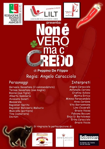 la Lotta contro i Tumori di Taranto. Domenica 27 novembre al Teatro Padre Turoldo di Taranto andrà in scena Non è vero ma ci credo di Peppino De Filippo.Diretta da Angelo Caracciolo, sul palcoscenico di via Laclos la compagnia teatrale ‘La Bisaccia’ rappresenterà le conseguenze comiche e semiserie del paradosso che spesso confonde l’apparenza e la sostanza. Da sempre cultrice della migliore tradizione drammaturgica partenopea, con la commedia di De Filippo ‘La Bisaccia’ indagherà le fobie e le contraddizioni dell’animo umano, collegate con il culto esasperato della superstizione.