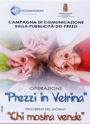 Commissario di pubblica sicurezza di Manduria e Confcommercio della stessa città messapica hanno ideato e varato una campagna di comunicazione sociale denominata, appunto “prezzi in vetrina”. Campagna, lanciata alla vigilia del periodo dei grandi acquisti per le festività natalizie, che è stata presentata, stamattina, nel corso di una conferenza stampa alla quale hanno partecipato il dirigente del Commissariato, il vice Questore aggiunto dott. Giuseppe Annicchiarico, il presidente della Confcommercio di Manduria, dott. Giuse Caforio, la vice presidente della stessa organizzazione di categoria, Grazia Messene, e il presidente dell’associazione dell’Ascom “Com & Com”, Gregorio Sergi.