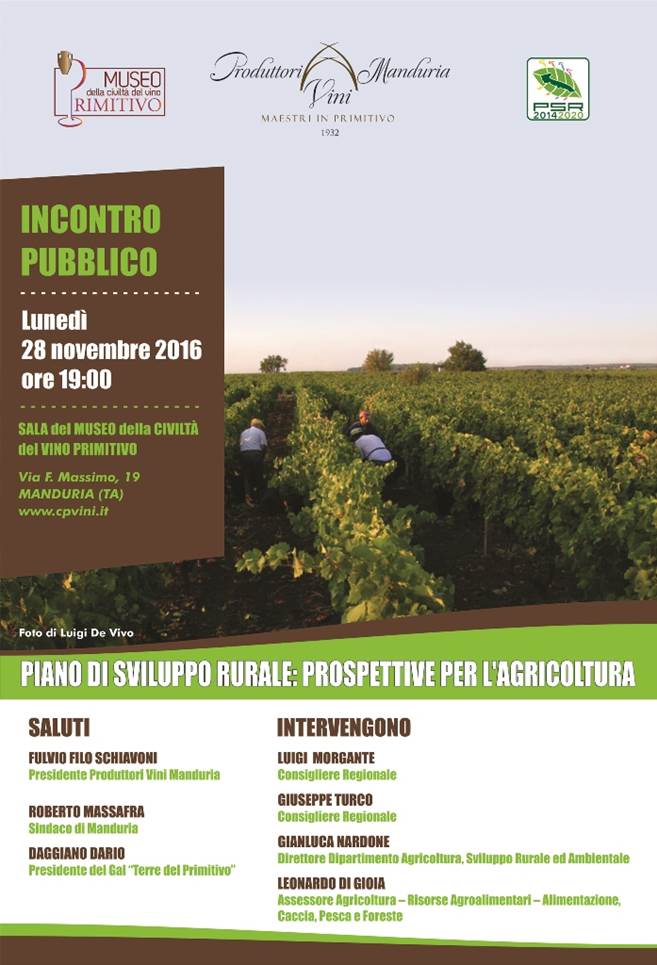 patrimonio di valore inestimabile, che in altri territori comunitari valorizzano e utilizzano efficacemente, per far sviluppare la propria economia e il miglioramento della qualità della vita.Il Programma di Sviluppo Rurale 2014 - 2020 della Regione Puglia (PSR Puglia 2014 – 2020), adottato dalla Commissione Europea il 24 novembre 2015, dispone di una dotazione finanziaria di 1.64 miliardi di euro, in grado di generare investimenti di oltre 2,1 miliardi di euro.